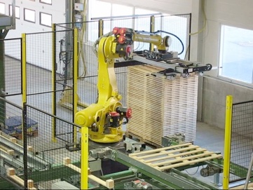 Robot przenośnikowy pracuje profesjonalnie z niezawodną precyzją przeobrażając spody palet i pokrywy na maszynie montażowej w jedną całość.