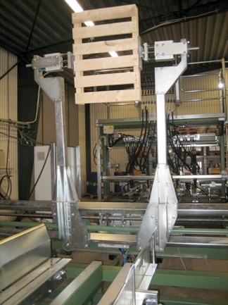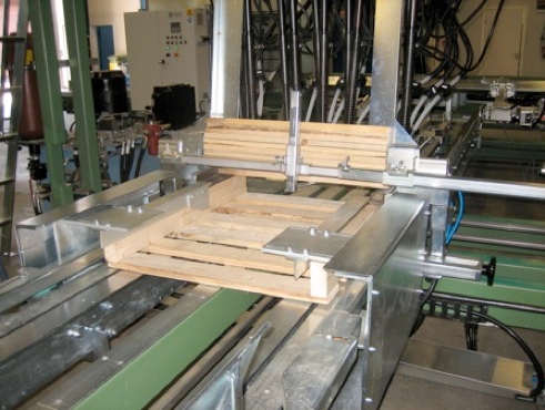 Paleta podsunięta jest do pozycji zbijania, gdzie deski ramowe zamykają paletę i są zamocowane.
